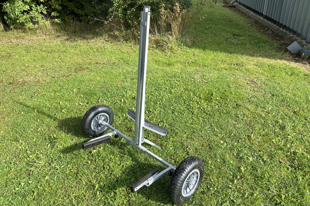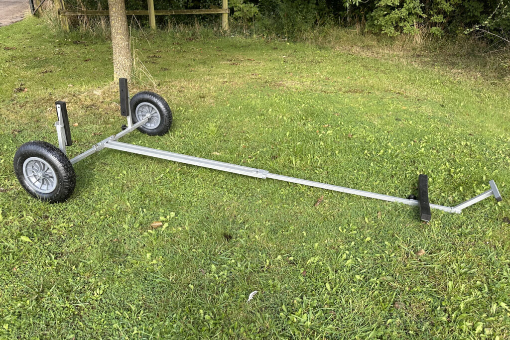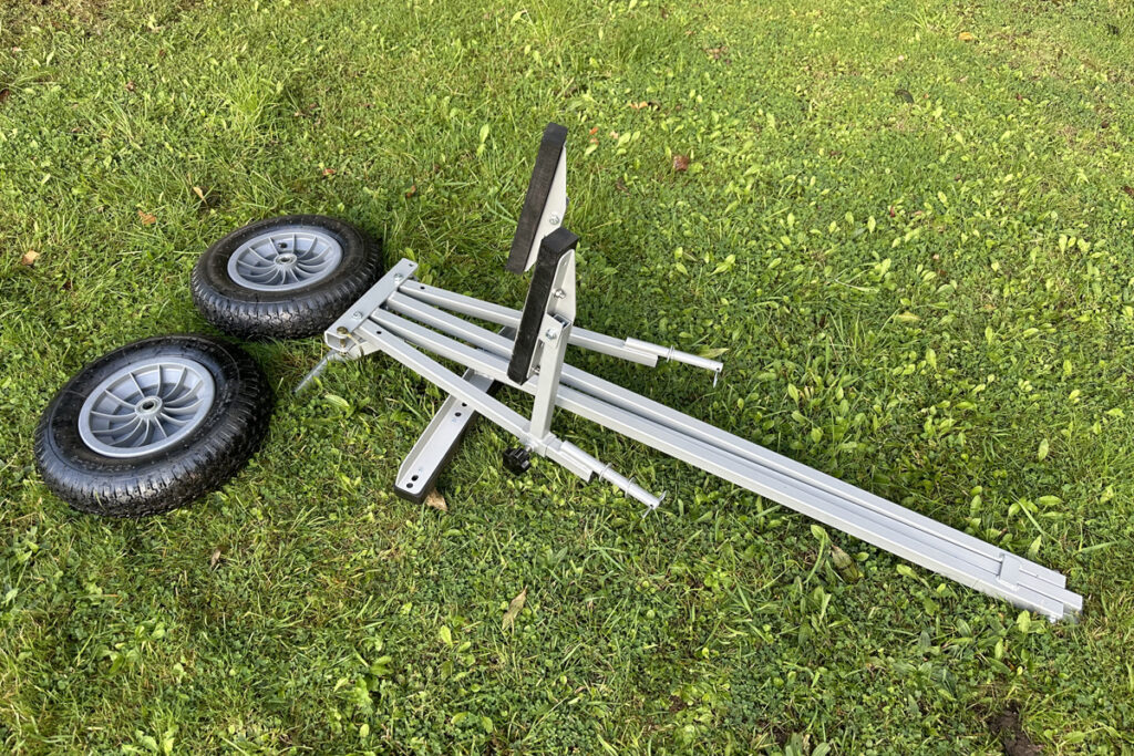 This can be folded for storage in ten seconds, or disassembled for transport in 2 minutes by removing the pins that secure the wheels and struts (see pictures). Ideal for transporting a boat from the car park to a slipway or beach launch.
